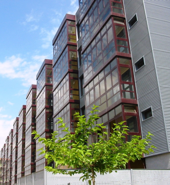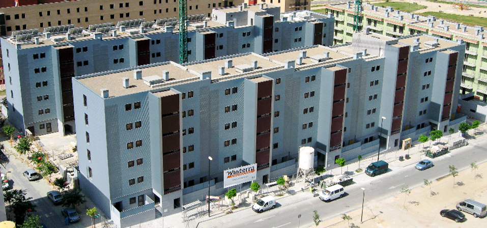 Tres bloques residenciales orientados en forma de U. Los 54 colectores de placa plana para captación de energía solar térmica, en cubierta del edificio sur, dan cobertura al 50% en la demanda de agua caliente sanitaria.