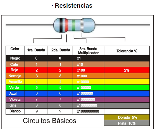 Con esta tabla podrás calcular fácilmente el valor de la resistencias o resistores fijos. También puedes usar este otro recurso.