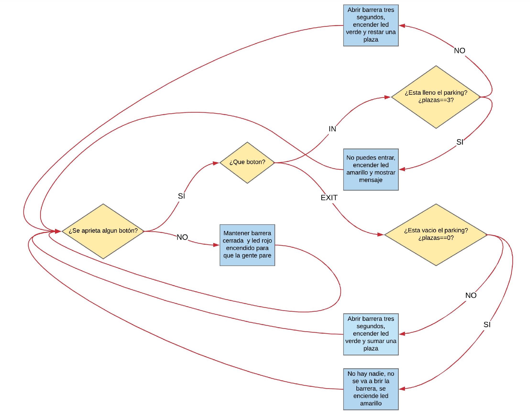 Si nos salimos de este tipo de configuración y diéramos prioridad a la pulsación de los botones de entrada y salida, antes que al número de plazas en el parking podríamos obtener un flujograma optimizado de este tipo: