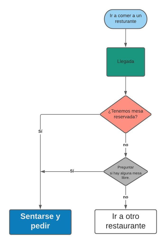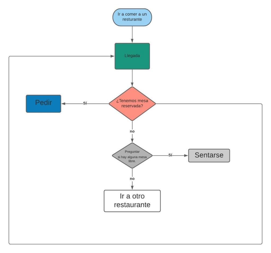Otro ejemplo interesante de flujograma realizado por uno de mis alumnos es este. Teniendo en cuenta que su aforo máximo del parking son 3 plazas, si te fijas cuando realiza la pregunta «¿Está lleno el parking? ¿plazas==3?» se refiere a plazas disponibles por lo que la palabra lleno debería haber sido vacío. A su vez, en la pregunta «¿Está vacío el parking? ¿plazas==0?» también se refiere a plazas disponibles por lo que la palabra vacío debería haber sido lleno.