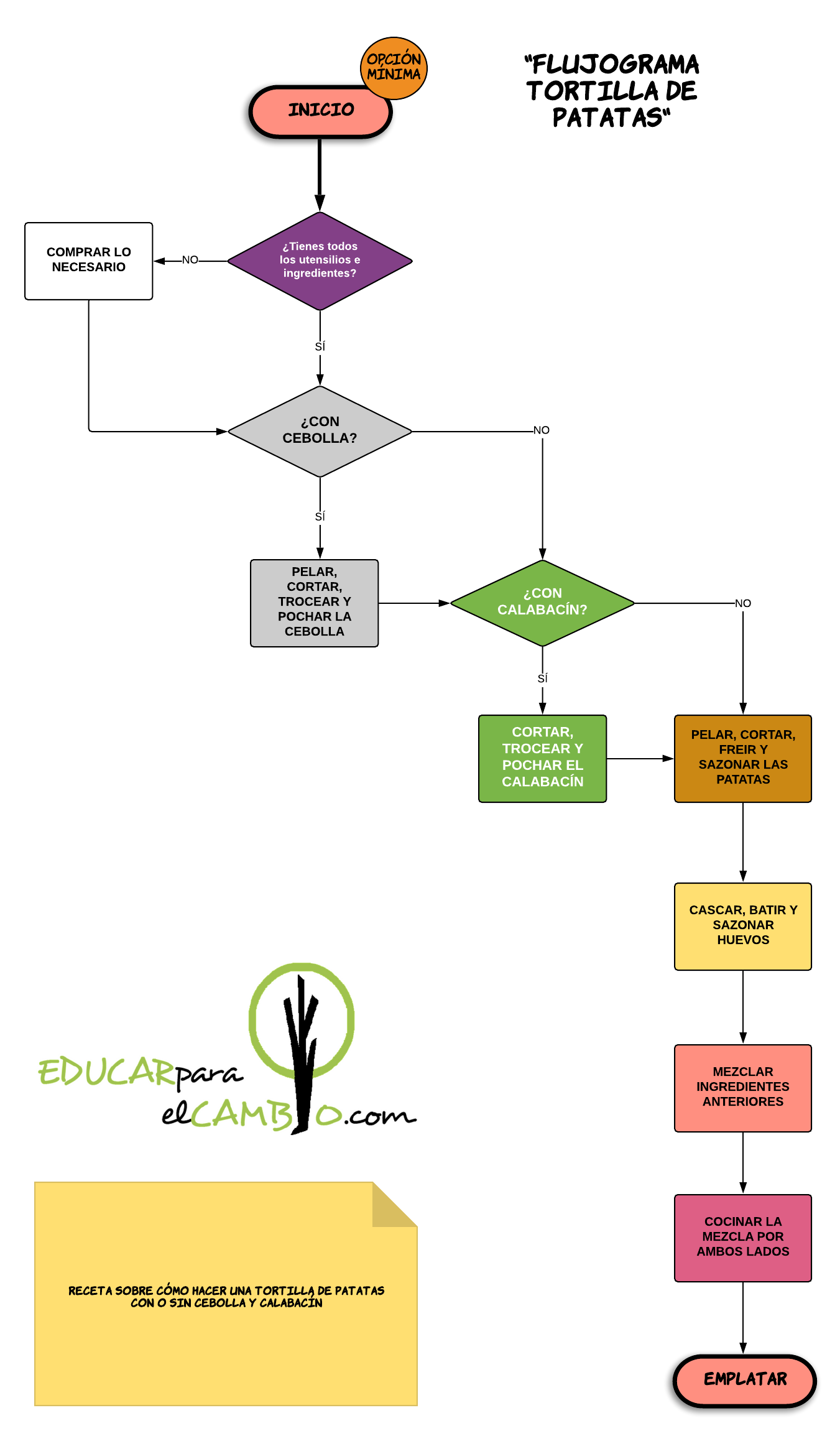 Como podéis ver este primer flujograma contiene algún error y es fácilmente depurable (optimizable, simplificable, corregible), si pensamos de forma más profunda buscando ahorrar procesos o símbolos podríamos llegar a este segundo flujograma: