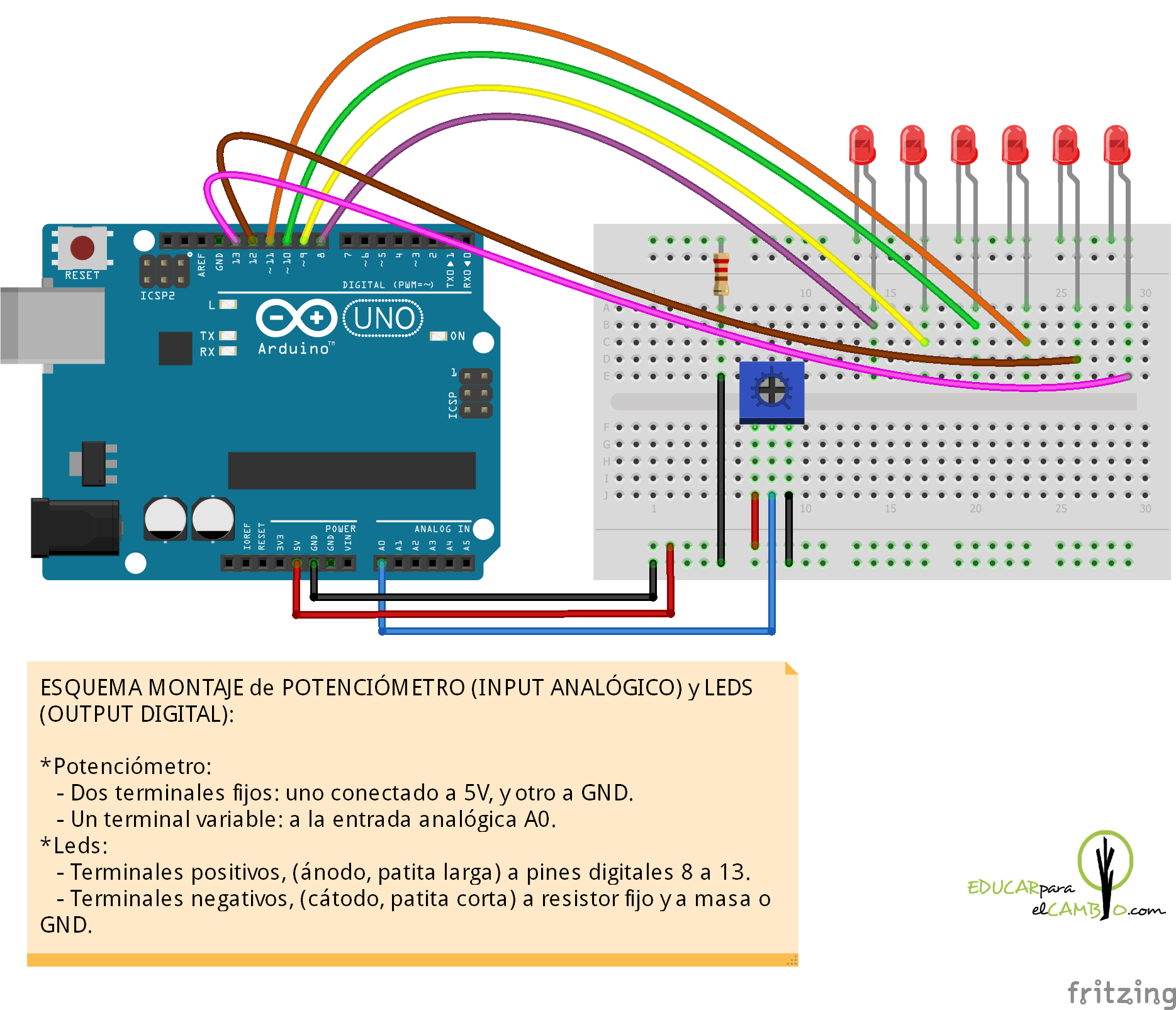 Para finalizar, un reto algo exigente a estas alturas: montaje de 6 leds para que se vayan encendiendo led a led a media que aumentamos el valor que transmite el potenciómetro. Quedaría algo parecido al siguiente esquema: