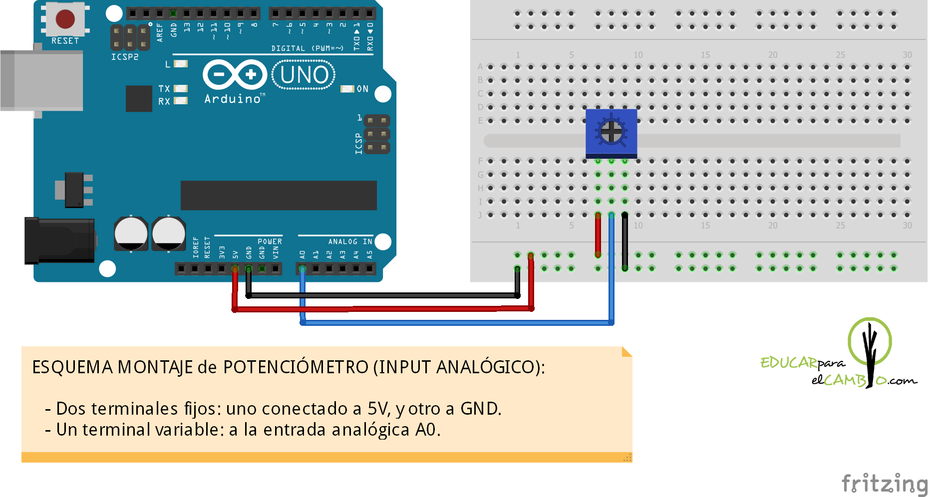 Normalmente un potenciómetro tiene tres terminales, dos fijos: uno conectado a 5V, otro a masa o GND, y el tercer terminal, variable y situado en el medio, será quien vaya conectado a nuestra entrada analógica.