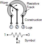 Los dos terminales extremos (en el esquema superior el nº 1 y 3) están unidos a ambos lados de la pista, por lo que siempre registrarán la resistencia máxima a su paso entre ellos, Rmax. El terminal restante corresponde al contacto móvil (en esquema el nº 2). Este terminal varia su resistencia respecto a los otros dos terminales a medida que accionamos el potenciómetro, siendo la suma de la resistencia a los otros dos terminales igual a Rmax (es decir, de 1 a 2 + de 2 a 3 = Rmax).