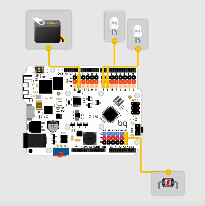 Cómo programar con el lenguaje de bloques visuales de Bitbloq una puerta automática con semáforo de paso incluido cuya apertura irá en función de la luminosidad que incida en el sensor LDR -Light Dependent Resistor- al ponerse un peatón o vehículo encima de él oscureciéndolo. Aquí tienes más información acerca de este maravilloso input analógico.