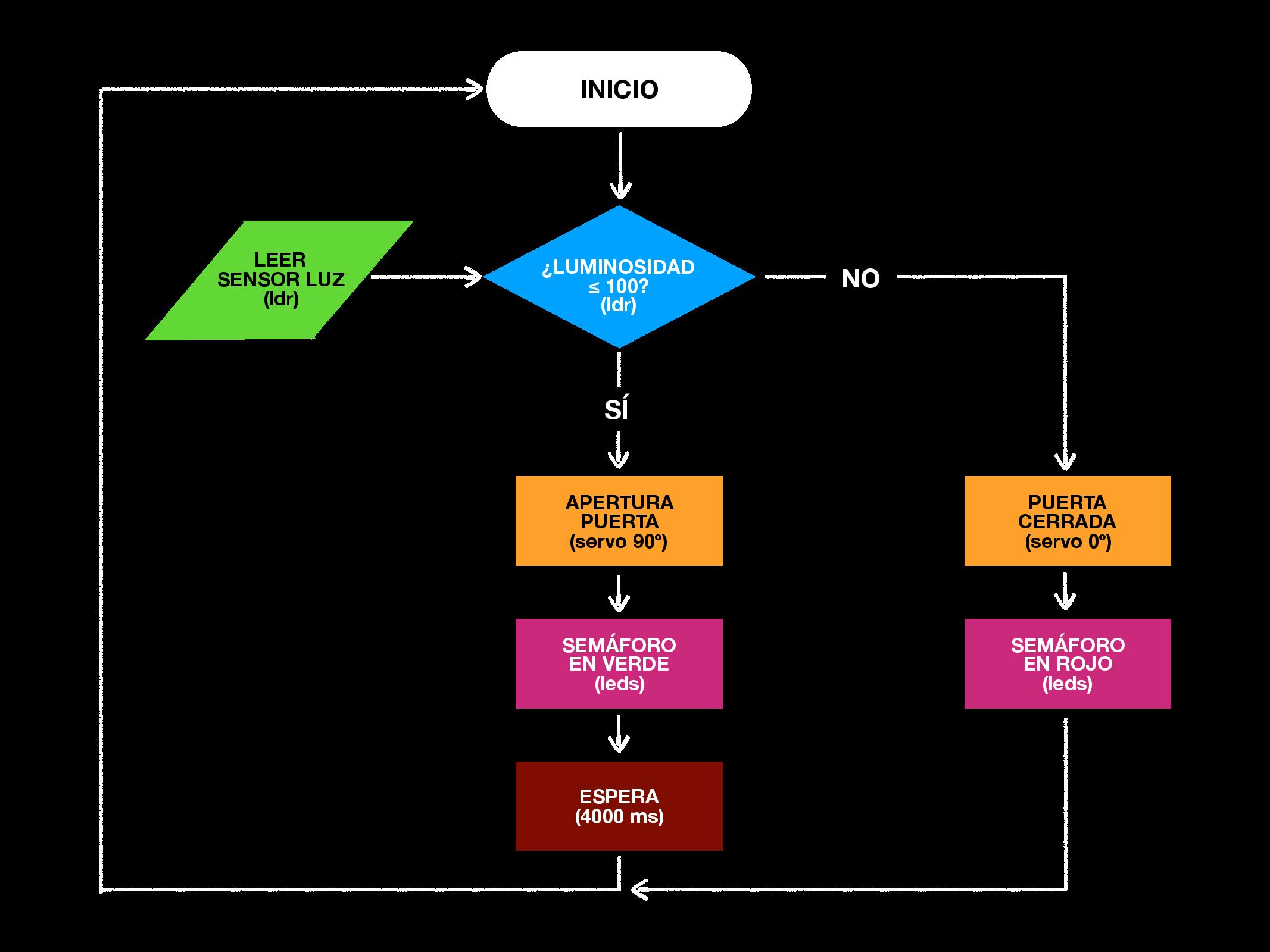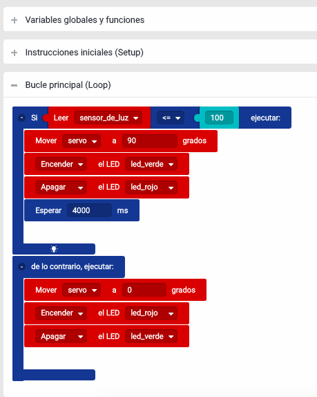 Cuando el sensor de luz detecta una luminosidad menor o igual a 100 unidades se ejecutará la apertura de puerta y el cambio de color del semáforo (pasará a verde), una vez realizado esto el programa esperará 4 segundos para el cruce de la persona o vehículo. Después de este tiempo de cortesía para que cruce cómodamente la puerta volverá a cerrarse y el semáforo regresará a su estado inicial (rojo).